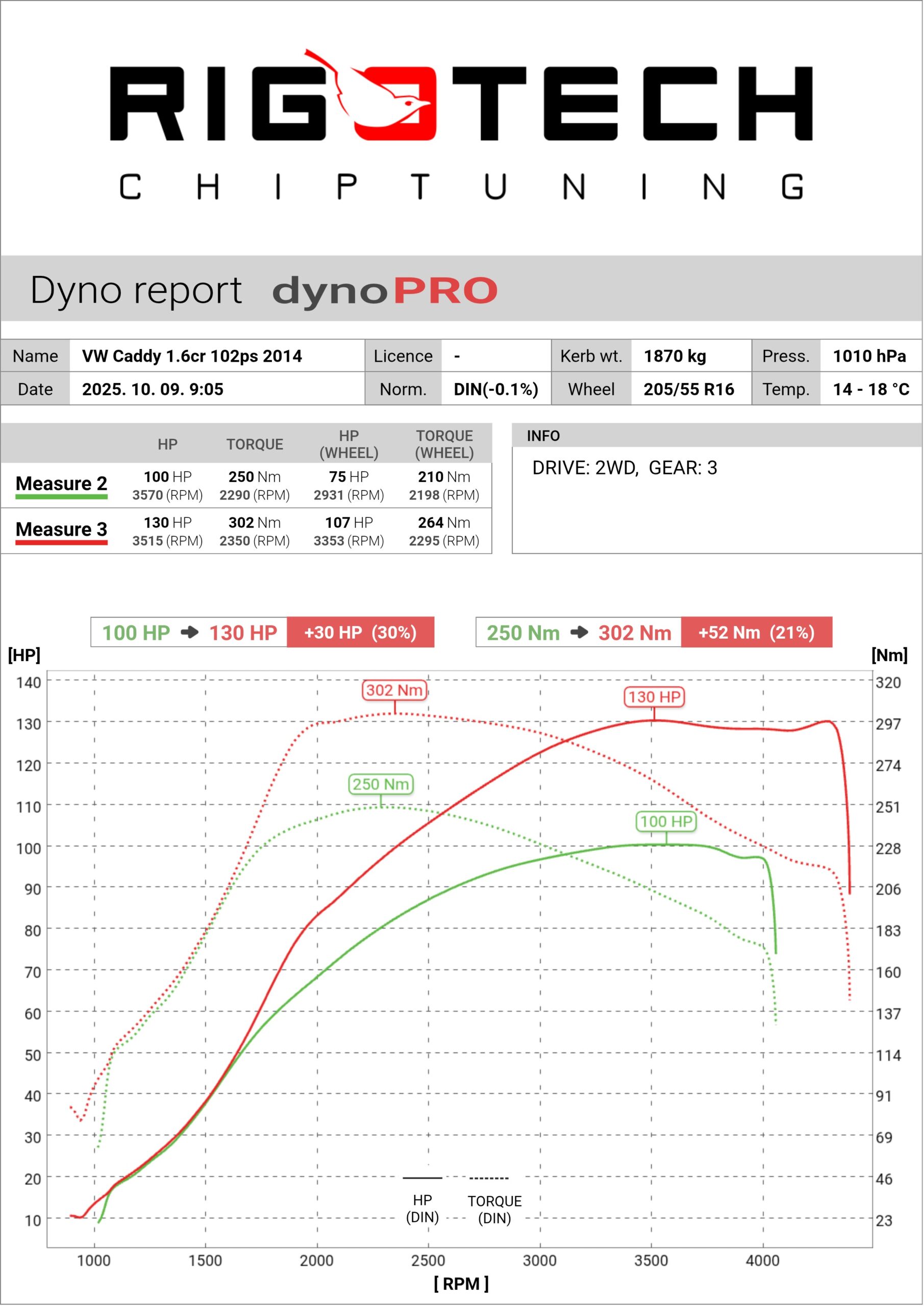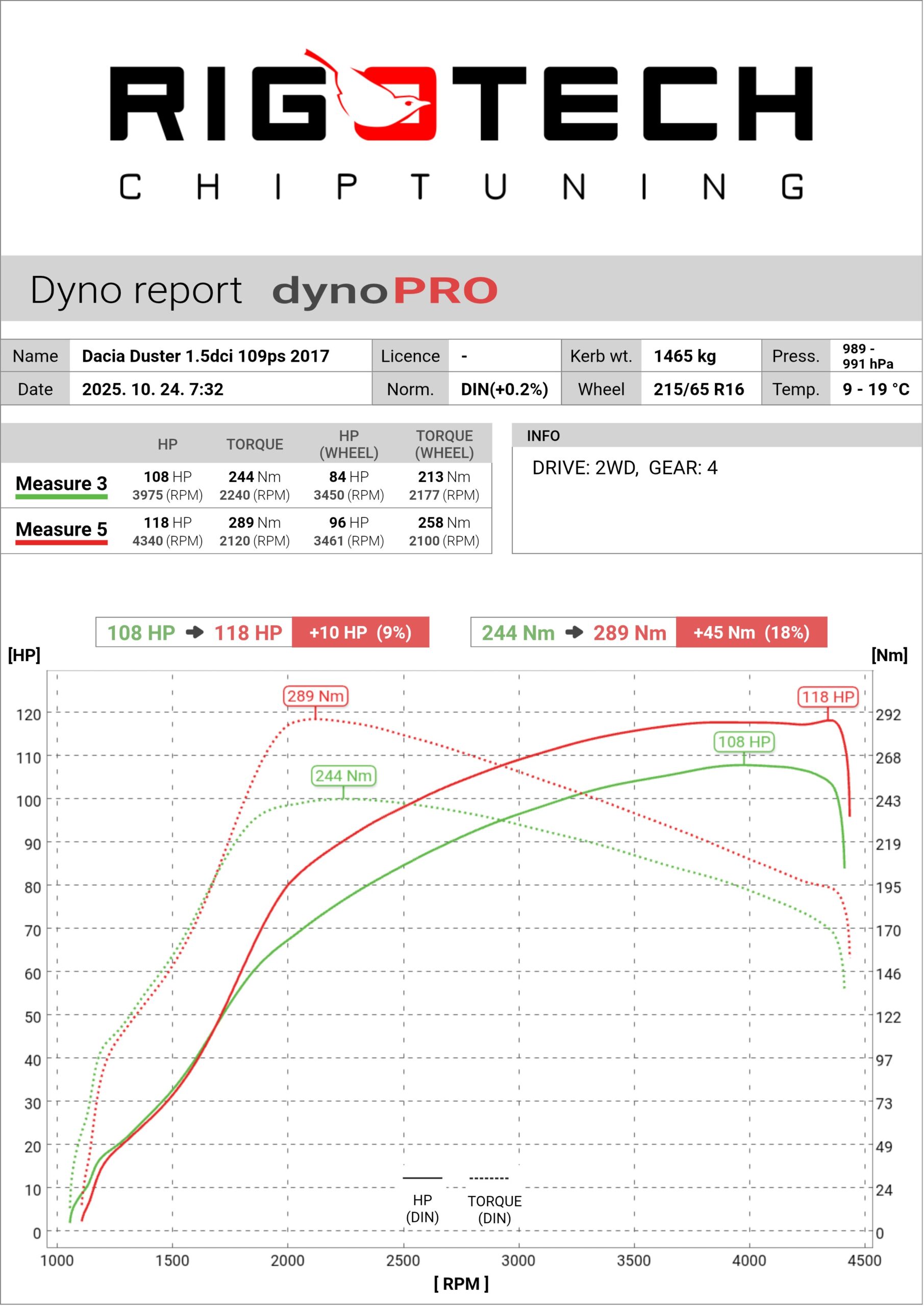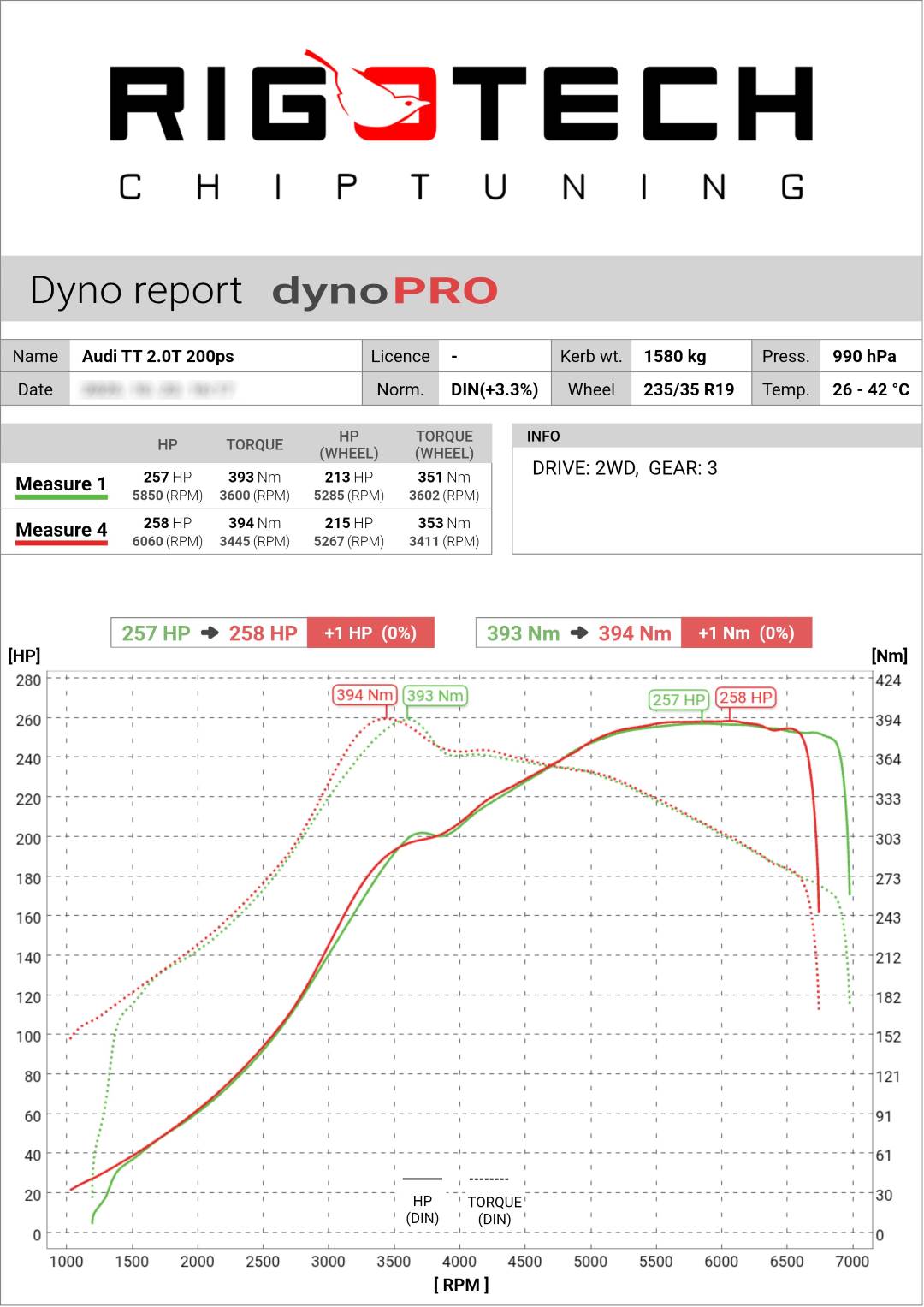 A riporton nem pontosan a mért értékek szerepelnek! Ennek oka, hogy a mért érték nagyban függ a környezeti viszonyoktól. A nyári melegben, kis légnyomás esetén a 100 lovas autót 90-nek mérjük (a pad ugyanígy!) Téli hidegben, 1000hpa és magasabb külső légnyomásnál ugyanennél 110 lovat is mérhetünk a jobb feltöltés, egyebek miatt. Erre találták ki, hogy mérjük a nyomást és hőmérsékletet, majd ezen adatokkal korrigáljuk a mérést. Ez a DIN szabvány szerinti kompenzáció. Ennek köszönhető, hogy végül függetlenül attól, hogy az olasz tengerparton, vagy az Alpok ritka levegőjében készül a mérés, a papíron mindig ‘100’ LE lesz.